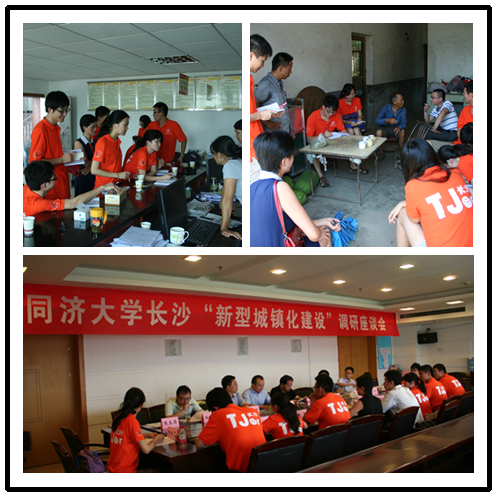 长沙“新型城镇化研究”暑期社会实践团由来自土木、交通、化学、艺术与传媒、声学等专业的12名本科、硕士、博士师生组成。抵达长沙后,与长沙市交通局、规划局、住建局、建设局、发改委、农委、政府办,长沙地区的县级、镇级政府等20多个政府职能部门举行了4场座谈会。走访果园镇、开慧镇、白箬铺镇下属的双河村、田汉村、红花村、葛家山村、光明村等7个村镇,深入30余户农户家庭进行访谈,针对长沙地区的城镇化建设,了解当地政策、调研先进经验、关注实际问题、取得了大量鲜活的第一手资料。在这期间,实践团了解到了双河村浔龙河项目“以人为本”就地城镇化建设的先进理念,看到了果园镇垃圾分类、沼气利用的先进设备,红花村为保障中小学生安全上下学配备的崭新校车,新民村产业结构调整后种植的高附加值的有机水稻和蔬菜,光明村因地制宜发展的休闲旅游农业;同学们更利用专业知识,与当地镇政府共同设计村间交通的解决方案。由于长沙连续一个多月未下雨,对当地水稻夏播、户外生产劳动带来了巨大困难,实践团的同学们还编制了《户外工作高温防暑注意事项》宣传单页,在当地乡镇发放,帮助居民共同抗旱。