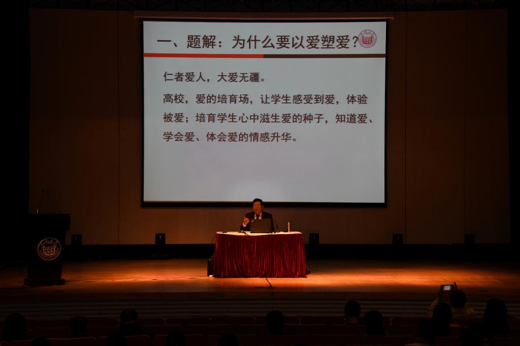 讲座开始,李占才教授首先对讲座题目“以爱塑爱、以心育心”进行了题解。教师为什么要“以爱塑爱”?李占才教授说,“爱是需要传递的,高校要成为爱的培育场,只有我们老师把爱给予学生,让学生感受到爱、体验被爱,他们心中才会滋生爱的种子,才会将自己的爱心奉献给社会、公众。否则,我们只能培养出精致的利己主义者。”