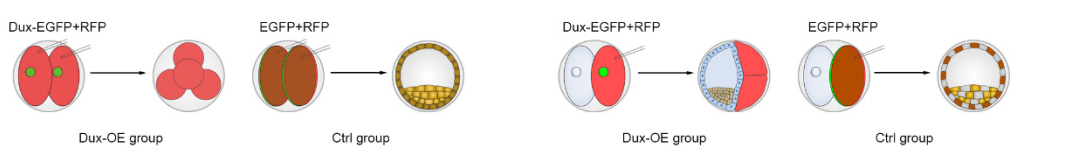 该团队还在正常胚胎的2-细胞晚期及4-细胞时期注射mRNA来延长Dux在体内的表达,他们发现Dux确实可以在胚胎中增强ZGA基因及MERVL的表达,这与体外在ES细胞中过表达Dux是一致的,但是延长Dux表达的卵裂球在分裂一次后停滞发育并最终死亡。他们还发现外源注射的Dux在胚胎中会被迅速降解,这与内源Dux瞬时表达的现象一致。如果在胚胎1-细胞时期注射,Dux会被更加快速的降解从而不影响胚胎的发育,这更近一步地说明了Dux及时降解这一事件在早期胚胎发育过程中的重要性。但是无论内源还是外源的Dux mRNA及蛋白在胚胎中是如何被快速降解的还不清楚。