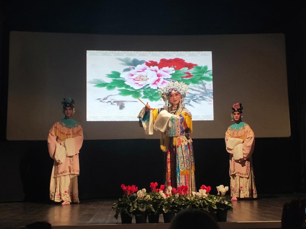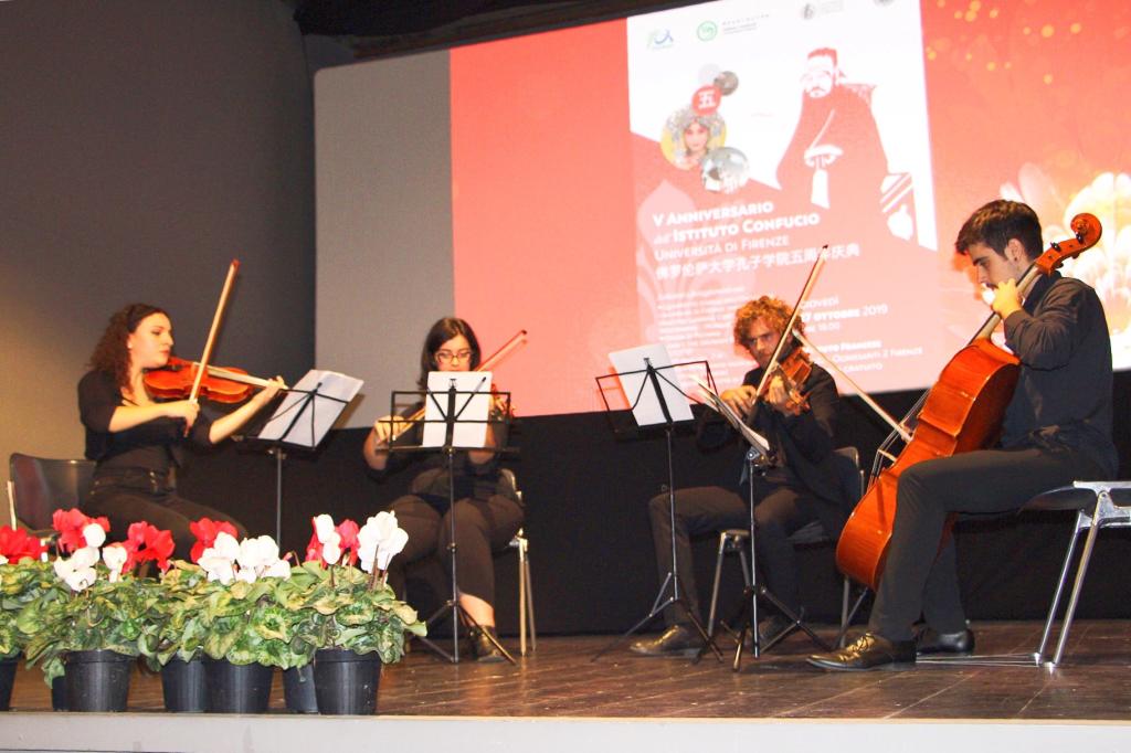 庆典晚会上,我校附属同济医院老年科副主任医师、中国京剧十大名票、著名京剧大师梅葆玖的入室弟子李健,与我校京昆艺术基地的本科生蔡筱君、博士生史彪飞合作演出京剧《贵妃醉酒》选段;体育教学部教师王静表演了功夫扇;古琴演奏家、教师倪诗韵演奏了《释谈章》和《平沙落雁》;古琴教师倪羽朦表演了琴歌《归去来辞》。圆润优美、富有韵味的京剧唱腔,如行云流水、刚柔并济的武术招式,低沉浑厚、幽雅婉转的古琴旋律,令在场意大利观众凝神屏息,会场掌声不断。佛罗伦萨大学学生管弦乐队表演了弦乐四重奏。