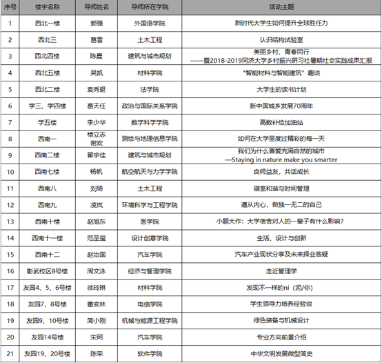 为纵深推进“三全育人”综合改革试点建设工作,全面提升人才培养水平,本学期,同济大学制定《同济大学2019-2020学年学生社区驻楼导师工作站建设方案》,在本科生社区全面推行驻楼导师工作站建设,推动知名教授、知名学者进驻学生社区,将育人力量和育人资源有机融入学生日常学习生活的第一线。目前,驻楼导师工作站已经运行一周,已有21位导师入驻学生社区,共开展社区讲堂、学术沙龙、成长问诊等21场活动,覆盖近30个学院310余名学生。