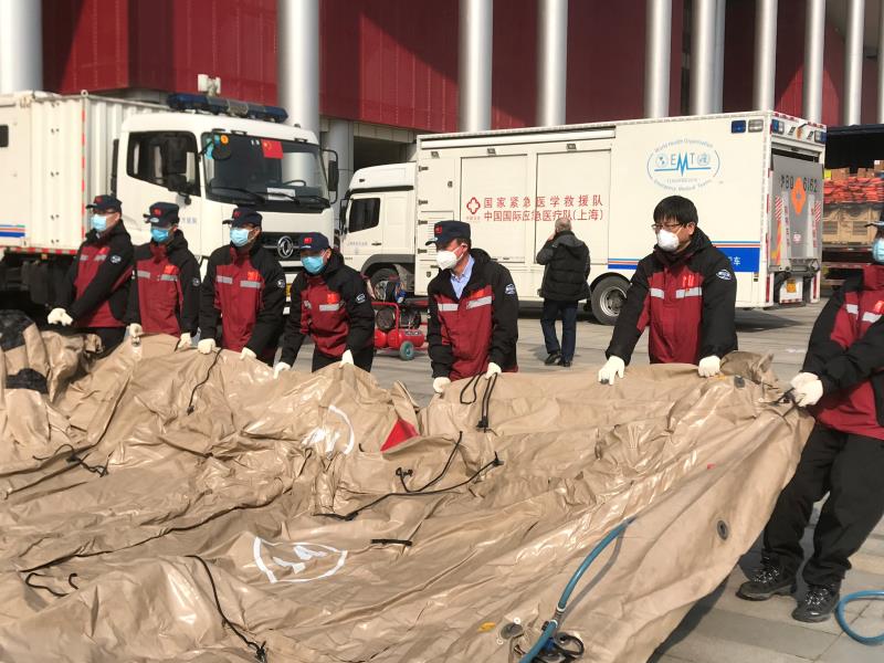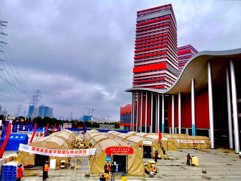 2月4日,受国家卫生健康委派遣,附属东方医院国家紧急医学救援队整建制55人分两路奔赴武汉疫区,受命驻扎在东西湖区(武汉客厅)方舱医院。2月5日下午,该队仅用3个多小时即搭建完毕25顶帐篷,完成了中等规模移动医院的展开。