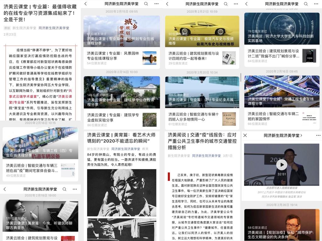 继新生院、济美学堂、同心济人学堂建设微信公众号平台,在疫情期间,济勤学堂、同德学堂陆续推出学堂公众号,开辟线上互动平台。同心济人工作团队通过学堂公众号,先后推出“同心济人防疫站”“云加油”“云德育”“班团在行动”等系列专栏,凝聚青年力量,推送原创主题累计阅读18945人次,学堂学生人均阅读24次;同德学堂结合水群、弹幕减压的特点开设B站直播,“同德社里欢乐多,宋泡安尼给你说,人类命运共同体,爱国主义要先行”,这样朗朗上口的网络传播口号受到了学生们的热追;济勤学堂借助学堂公众号“济小勤”,完善学生线上办事需求,结合短视频、H5页面互动等学生喜欢的传播形式,做好战疫宣传品展示、网课学习指南、时政评议等,创新学生思政和服务工作;济美学堂依托网络平台,疫情期间打造新生“云端校园文化”新品牌,推出“济美小科普”“济美解忧铺”等栏目,做好科学防疫知识普及、防疫心理疏导,推出“‘疫’线故事”系列推送,讲述疫情期间的暖心故事和济美学子投身志愿服务的担当。新生院团工委和新生院新媒体中心积极探索新媒体直播室建设,深度升级线上平台,为居家学习期间的学生线上思政工作做好硬件准备。