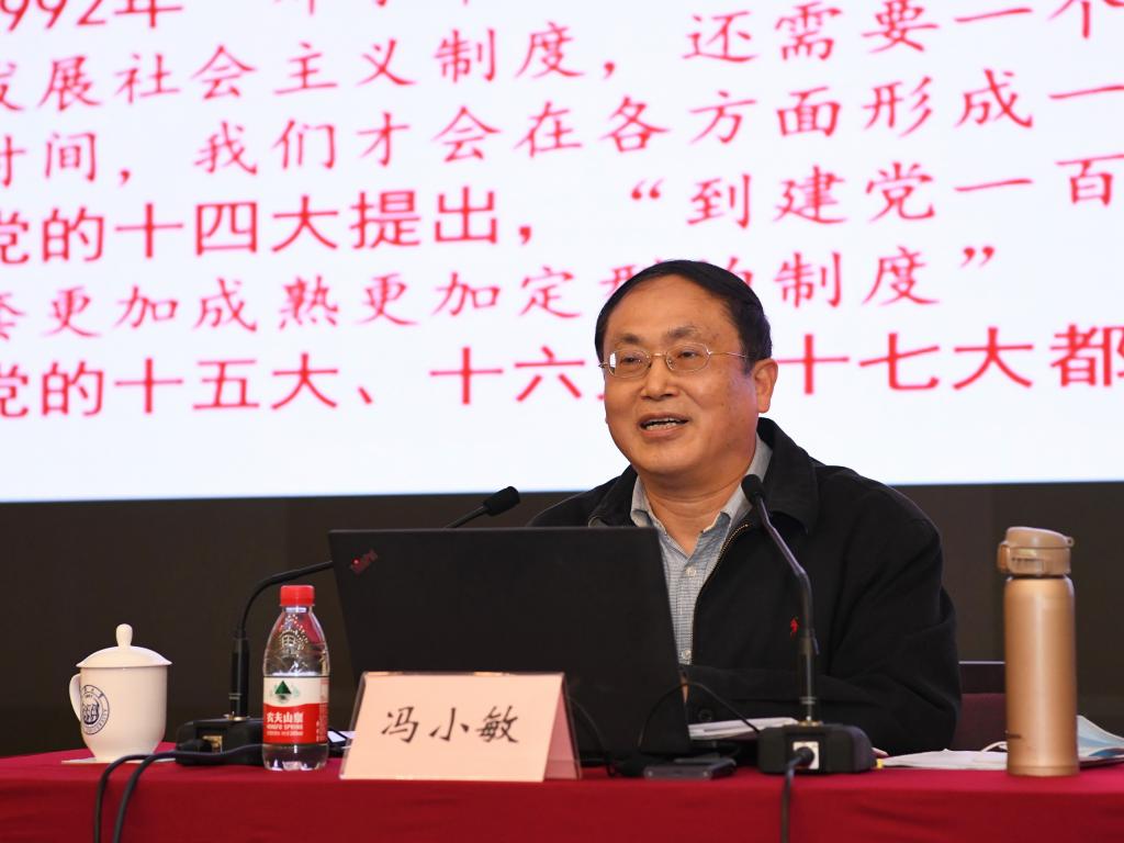 冯小敏的报告以《学习十九届四中全会精神,坚持完善中国之制,推进中国之治现代化》为题,从四个方面对十九届四中全会精神进行了系统阐释和深入解读。这四个方面分别是:一是充分认识十九届四中全会及其主题的重大意义;二是深刻认识中国特色社会主义制度和国家治理体系的显著优势,坚定制度自信;三是准确把握坚持完善中国特色社会主义制度、推进国家治理体系总体要求、总体目标和具体要求;四是加强党的领导,确保十九届四中全会制定的各项目标任务全面落实到位。