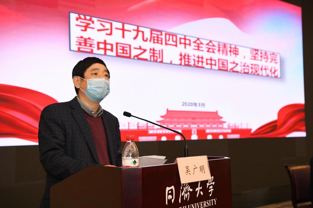3月24日下午,同济大学中层干部深入学习贯彻党的十九届四中全会精神培训班第二场专题讲座开讲。上海市委党的十九大和十九届四中全会精神宣讲团成员、上海市习近平新时代中国特色社会主义思想研究中心研究员、中国浦东干部学院和上海市委党校特聘教授、原市委组织部副部长、市委党史研究室主任冯小敏应邀来校,为中层干部作十九届四中全会精神辅导报告。报告会由校党委副书记吴广明主持。学校中层干部分别参加了逸夫楼的主会场和视频分会场的学习。
