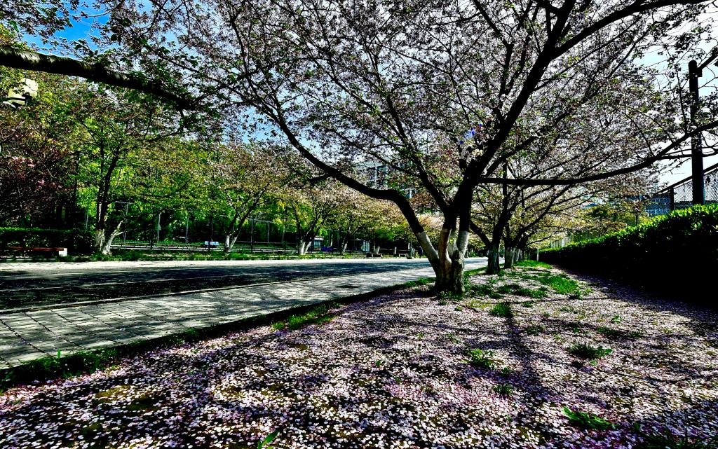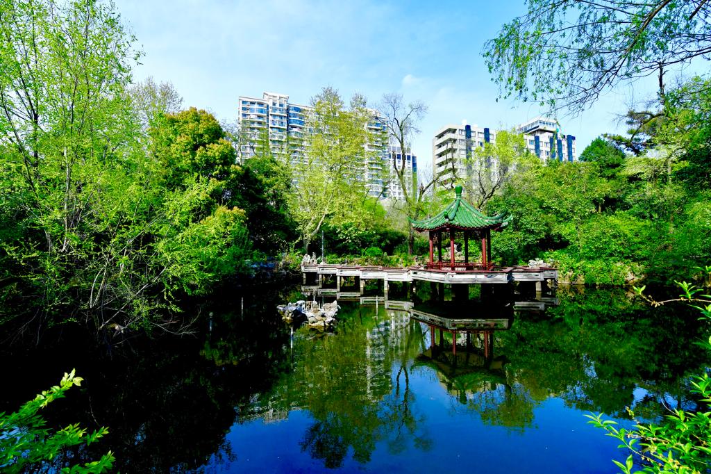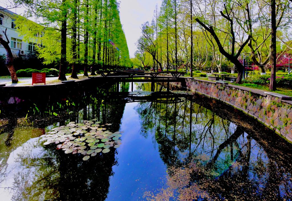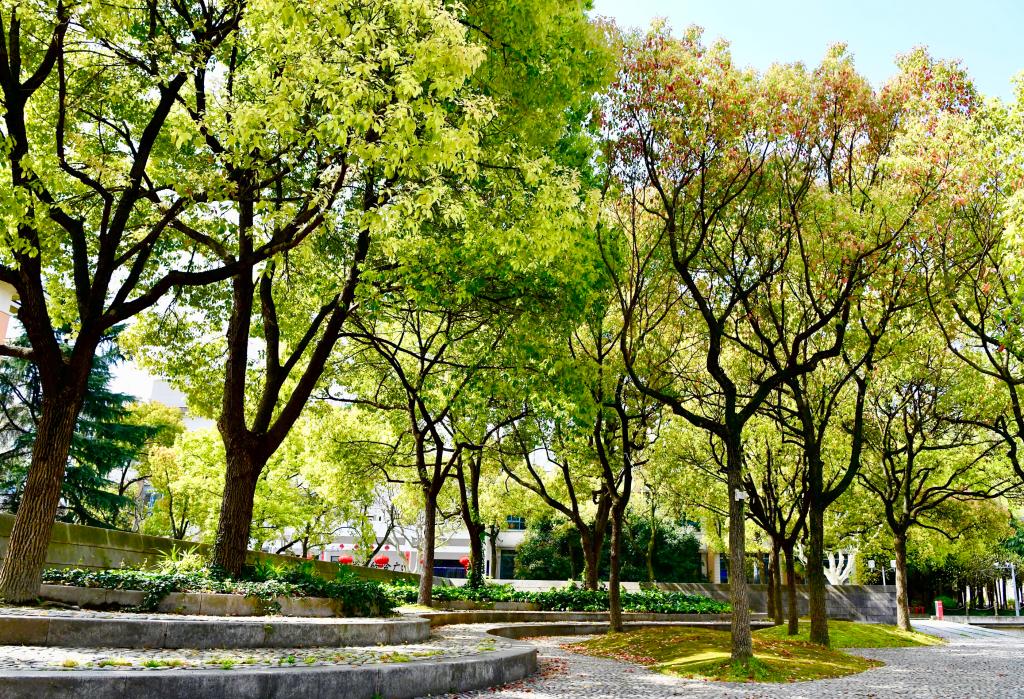 四月的同济园,落英缤纷,满园绿意葱茏,处处如诗如画。