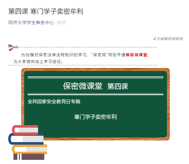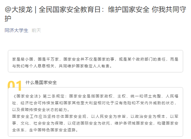 4月14日,学校组织学生观看一堂国家安全教育大课,通过新媒体平台积极转发权威部门、主流媒体相关宣传内容,如同济大学生、学生事务中心等公众号陆续推出《全民国家安全教育日:维护国家安全 你我共同守护》《一图读懂总体国家安全观》等推送内容,还特别开通保密微课堂,为同学们提供线上学习途径,以真实案例向广大师生进行科普。