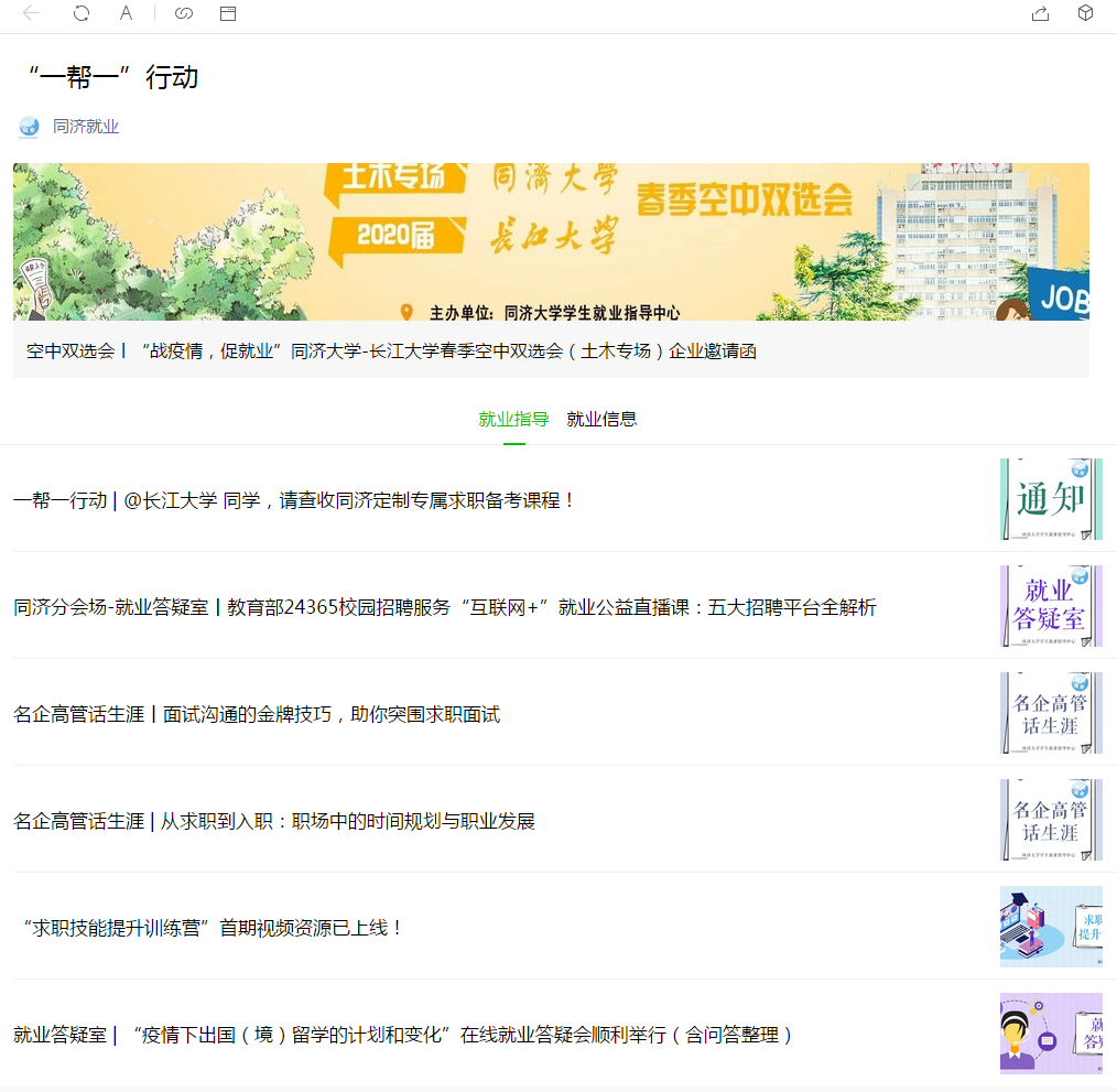 据悉,自教育部启动实施全国高校与湖北高校毕业生就业创业工作一帮一行动以来,同济大学立即响应,于414日举行两校联合就业工作视频会议;417日,“同济就业”微信公众号开辟“一帮一”专栏;425日,两校联合空中双选会(土木专场)即将启幕。围绕“共享资源、共办活动、定制帮扶”的工作思路,目前已共同举办4场空中招聘会、4场公益直播课,并定制了生涯教育与招聘活动菜单,供长江大学各年级学生分享与参与。