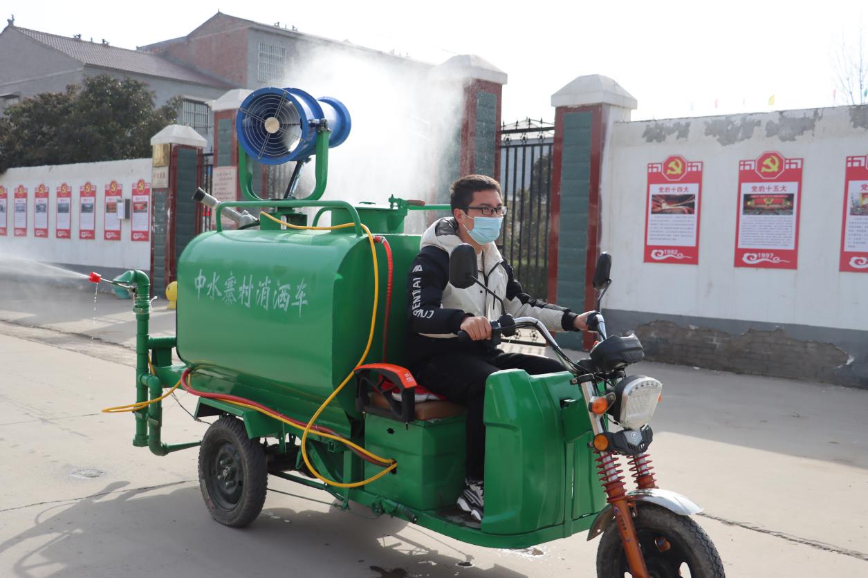 马明杰驾驶降尘雾炮消洒车为村街消毒防疫