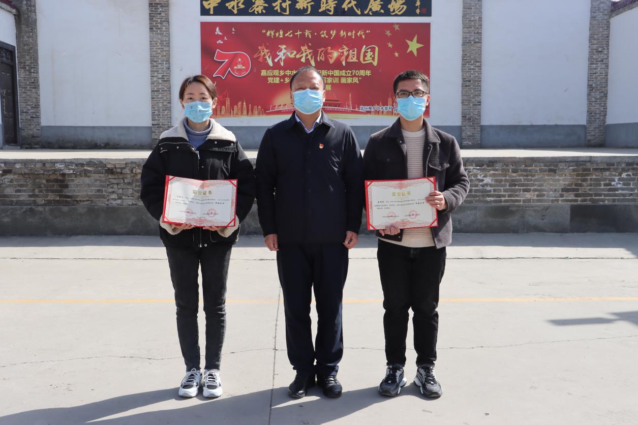 武陟县嘉应观乡党委书记韩剑为中水寨村两名博士颁发“防疫尖兵”证书