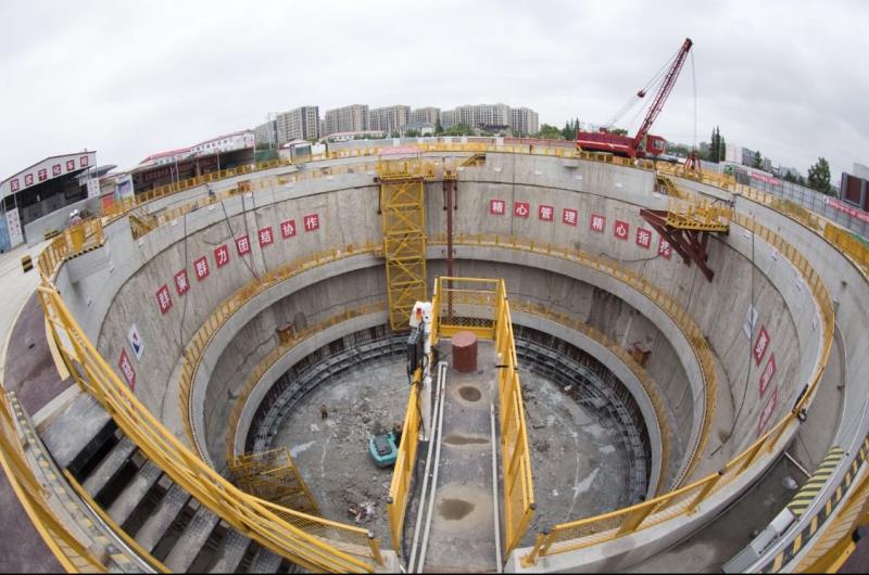 现场,灰与深灰是底盆的主色调,青蓝的挖掘机仿佛一只螳螂趴在坑底,巨大的圆环让它怀里的一切都变得很小很萌,黄色钢网柱体围护的楼梯,让灰色的空间活跃起来。深井已经挖到30米。现场工程师介绍,得让坑底晒晒,扰动的土层“冷静冷静”。地面,横跨井圈的橘红色大门吊,两只大钩子是开挖作业时往上吊运泥土的,工程师说“一次可吊7吨”。这一边,一架红体白标(企业图标)的抓斗车,6只红爪子安安静静地合在一起。