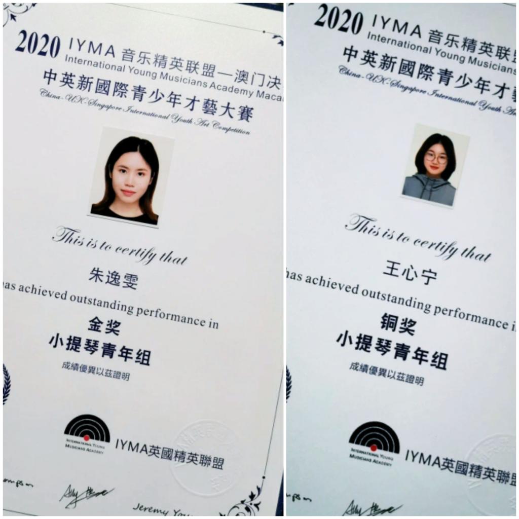 日前,2020“IYMA”音乐精英联盟暨中英新国际青少年才艺大赛总决赛在中国澳门举行。由珠海、武汉、香港、上海等地初赛脱颖而出的一众选手同台竞技,我校艺术与传媒学院音乐表演专业2018级朱逸雯同学、2017级王心宁同学在我校沈婷老师指导下,分别荣获小提琴青年组金奖和铜奖。