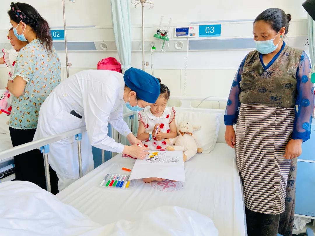 想到这些藏族小朋友身在异乡,医院的“小青团”志愿者们一同为8位患者及其家属送去慰问和礼物,这些礼物是东方医院全体护理人员用今年5·12国际护士节义卖所得善款购置的,既实用又可爱的小书包、小帽子、彩铅套装等表达了医生和护士对小朋友们的期望。同时,东方“小青团”们还为小朋友们送去了刘中民院长主编的《图说灾难逃生自救科普丛书》,这些精装绘本专门针对儿童急救学习,旨在加强孩子们灾难求生救援的能力。