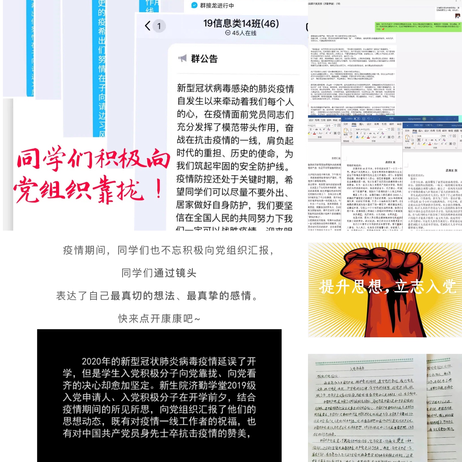 疫情期间,新生院济勤学堂通过20个班级群面向817名学生在线上再一次开展入党启蒙教育,又有一批学子递交入党申请书。学堂所在的新生院党委第六党支部举办了线上党组织生活、“寻找战疫中的优秀党员”主题思想汇报,以及带领学生创作“我承诺”系列组图,倡议“风雨同舟,济勤(寄情)武汉”,获得学子热烈响应。
