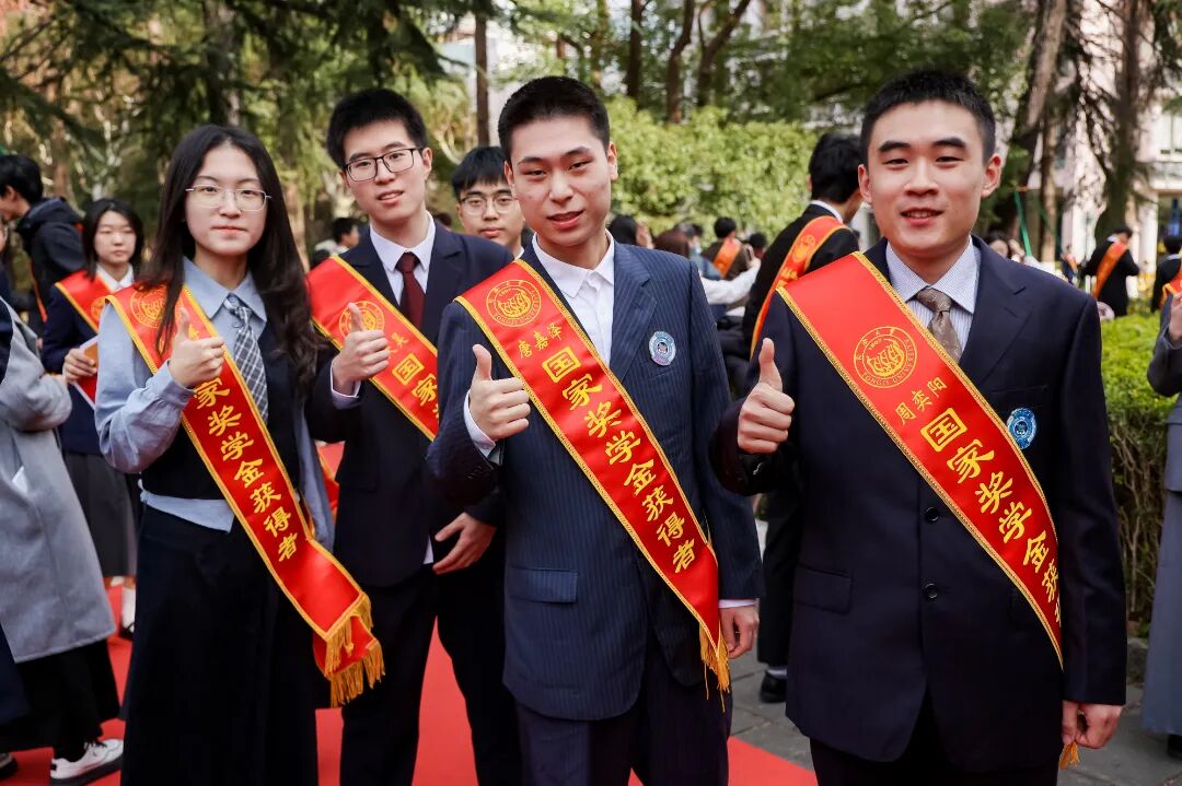 走红毯,寄“喜报”,与远道而来的家人合影留念,和共同成长的朋友分享喜悦。典礼前后,大礼堂外喜气洋洋。获奖学生们在学校专门设置的喜报邮筒、姓名墙前拍照打卡,仪式感满满。