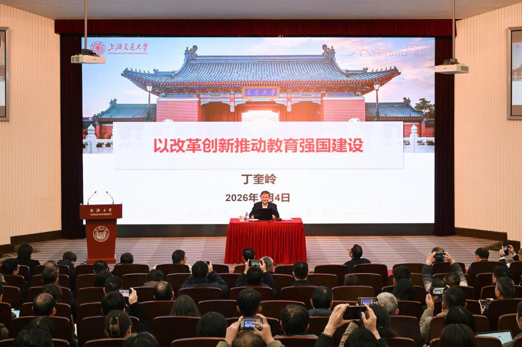 1月4日是2026年的首个工作日,同济大学当天下午召开党委理论学习中心组(扩大)学习会,邀请上海交通大学校长、中国科学院院士丁奎岭作专题辅导报告,分享对教育强国建设中高等教育使命任务的思考,以及上海交通大学以改革创新统筹推进教育科技人才一体发展的实践探索。