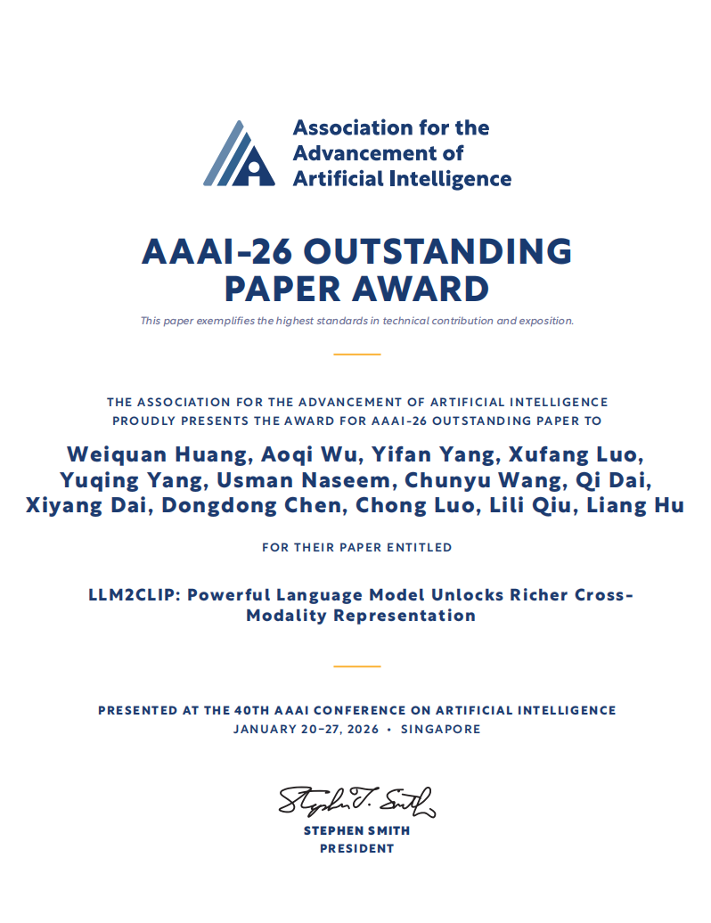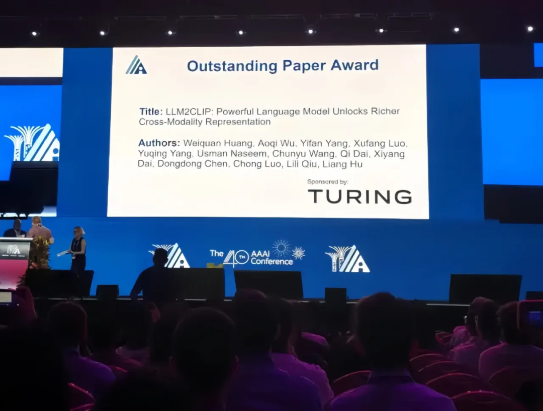 该获奖论文题为“LLM2CLIP: Powerful Language Model Unlocks Richer Cross-Modality Representation”。CLIP是当前人工智能领域具有重要影响力的多模态基础模型,其核心思想是通过大规模图像与文本数据的联合训练,使计算机能够在同一语义空间中理解图像和语言,从而支持图像识别、检索等多种任务。随着大型语言模型(LLM)的快速发展,其在语言理解和世界知识建模方面展现出显著优势。基于这一背景,研究团队深入探讨了如何将LLM的强大语言理解能力引入CLIP框架,以提升模型对复杂、冗长文本描述的理解能力和视觉感知能力。为此,团队提出了一种高效的模型微调方法,在保留原有CLIP结构的基础上,将LLM有机嵌入其中,实现对多模态表示能力的增强。