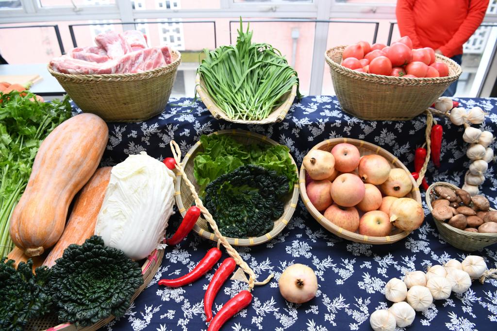 当天,为更好地营造冬至节气的体验氛围,我校设计创意学院学生对面食部的室内环境作了精心的设计和布置。在入口处,摆放着绘有迎冬至元素的屏风,并展示有南瓜、大白菜、韭菜、苹果等时令蔬菜、水果。天花板上挂有灯笼,窗户上贴有窗花。