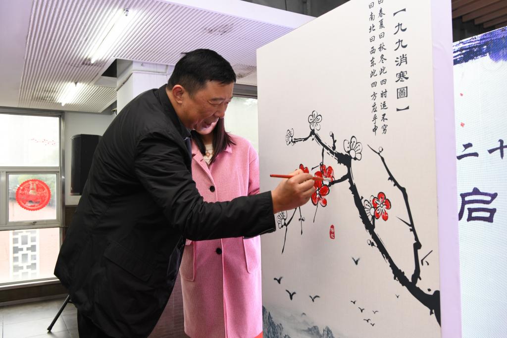 当天下午3时半,随着师生代表在一幅《九九消寒图》上绘出九朵红梅,拉开了四平路校区“二十四节气传统文化教育”系列活动的序幕。