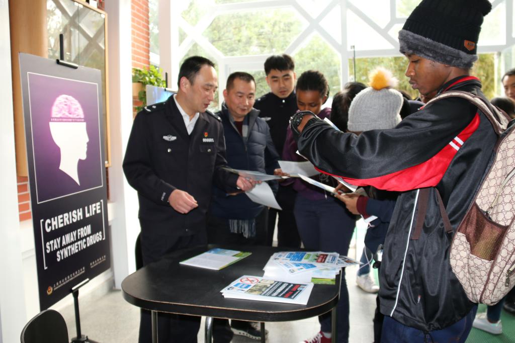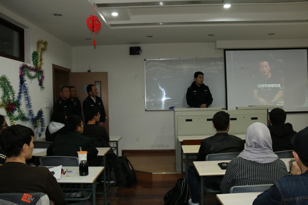 文保分局民警任伟健警官通过专题法制讲座和安全知识讲座的形式,向我校留学生宣传我国的法律、关于禁毒方面的措施、安全知识和在特定场所的自我保护方式。此外,还通过发放宣传单、现场交流等方式,宣传禁毒法律和知识。