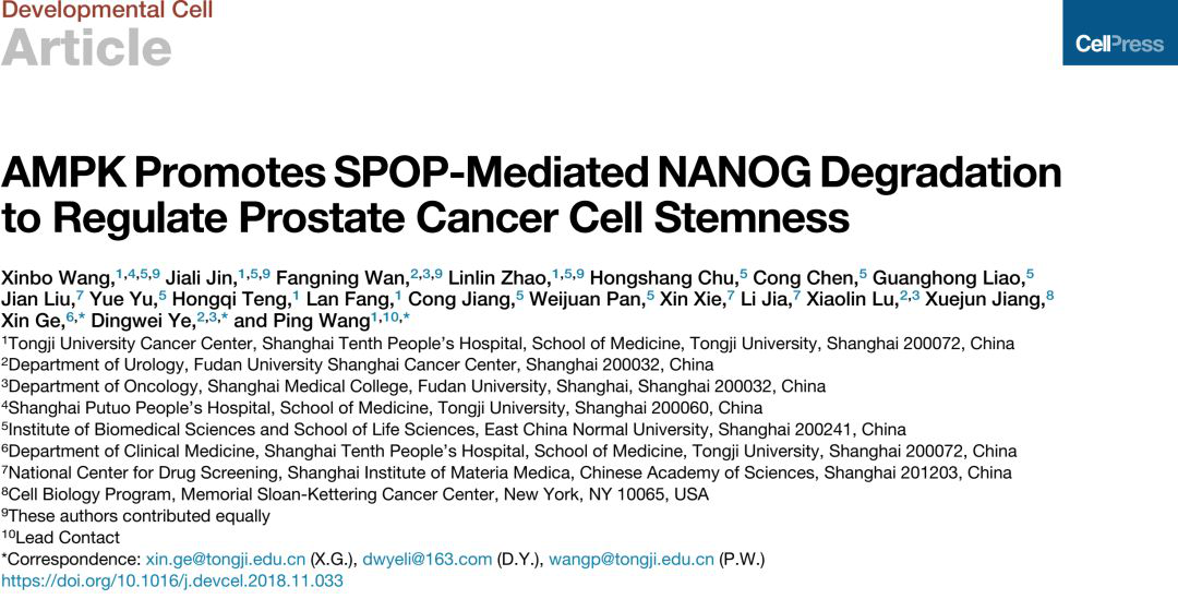 同济大学王平教授长期致力于研究泛素化修饰与肿瘤微环境调控。12月27日最新一期Developmental Cell 杂志在线发表了王平教授团队题为AMPK promotes SPOP-mediated NANOG degradation to regulate prostate cancer cell stemness 的研究论文,从蛋白质翻译后修饰的角度阐明了肿瘤干细胞调控的新机制及其在肿瘤发生发展中的作用。