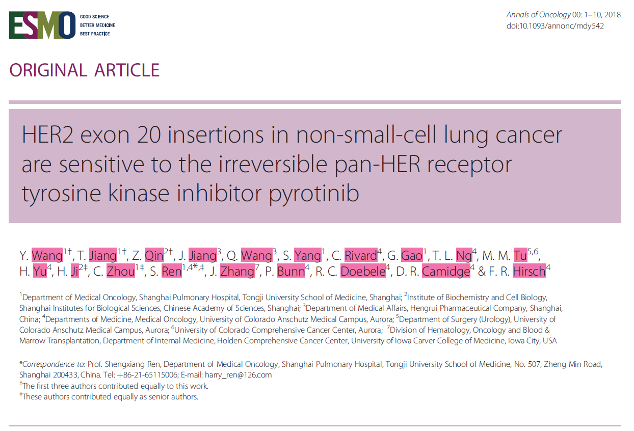 吡咯替尼是江苏恒瑞医药研发的一种口服、不可逆的泛HER受体酪氨酸激酶抑制剂,具有抗EGFR/HER1,HER2,HER4的活性。因该药在临床前及1-2期临床研究中表现优异,已获批用于乳腺癌的治疗。针对非小细胞肺癌,同济大学附属上海市肺科医院周彩存教授及任胜祥教授与中科院上海生化细胞研究所季红斌教授团队合作,利用患者的肿瘤活检标本成功建立了HER2-20外显子A775_G776YVMA插入突变肺腺癌类器官(organoids)模型和人源肿瘤异种移植(PDX)模型,验证吡咯替尼的抗肿瘤活性。其研究结果发表在最新一期的欧洲肿瘤内科学会(ESMO)官方期刊 《Annals of Oncology》(2017年影响因子:13.930)上。文章同时介绍了临床研究的结果,首次报道了吡咯替尼治疗HER2突变非小细胞肺癌的疗效及安全性数据。