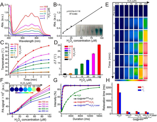 图2:基于酶活性的Gd@HRPABTS 探针在肿瘤微环境中的特异性光声成像及MR成像