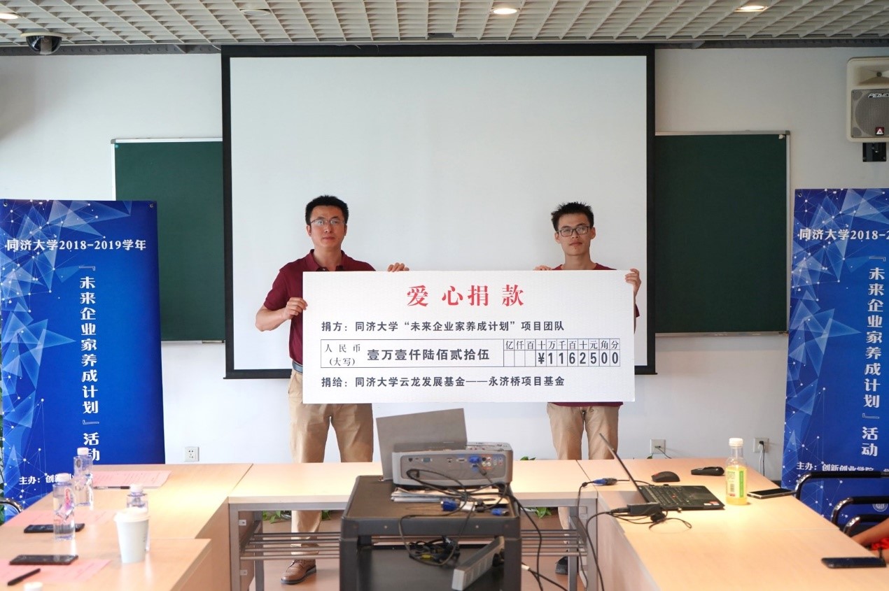 终期汇报活动由四个组的CEO分别介绍各自项目开展情况及收获和感想。创新创业学院专职副院长周斌为四个组的创业导师颁发聘书,学生代表将本次活动收入所得11625元捐赠给同济大学云龙发展基金——永济桥项目基金。本次活动还获得同济大学第五届班长论坛“优秀班级工作案例”。