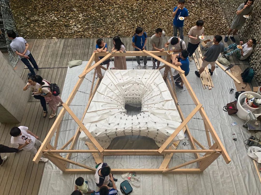 经过7天的学习,第一组同学逐渐学会了如何通过调用COMPAS中的数据库来完成对rhino 模型中的几何操作(例如求解网格面的向量,offset操作等)。当然在学习过程中还需要大量的计算机图形学的基础,需要同学后期提高。最终的混凝土壳体虽未能来得及浇灌,但是整个框架系统完成了搭建,从节点到脚手架基础体系,提现了模板技术的严谨体系。
