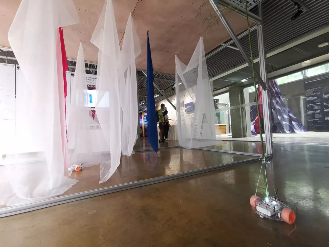 第2组致力于通过和一组由可移动机器人驱动的布料进行互动,建立一种可变形的柔性建筑。移动机器人被放置在框架结构的顶部平台,并通过一组磁铁连接和移动布匹。每个机器人由两台直流电动机驱动,并作为单独的动态执行器。这些机器人在布匹移动变化下产生响应式柔性环境。通过一定的人的输入,这些移动机器人以群体的形式移动,产生预期的舞蹈效果。此外,这些移动的布匹通过不同的透明度和颜色的创造了另一层有趣的环境氛围。
