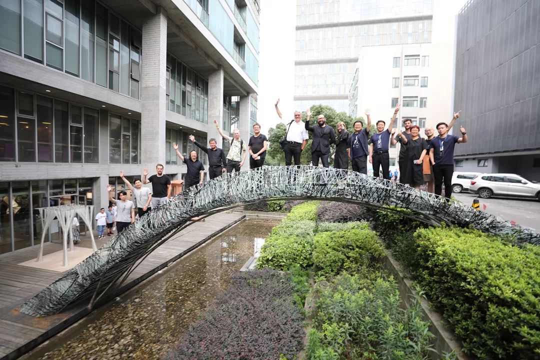 通过新材料工艺和机器人建造平台的结合,该组完成了两件多材料建造作品:金属打印与纤维编织桥和织物塔。纤维、织物、树脂等柔性材料的加入自以及机器人金属打印工艺的应用使两件作品都有明显的轻质高强效果。金属打印与纤维编织桥重量不到600kg,跨度达到11米,可承载重量超过1.5吨。织物塔高度达到7.2米,完全实现自支撑,但自重仅为260kg。材料的特性在结构性能化设计和机器人建造的支持下被充分挖掘