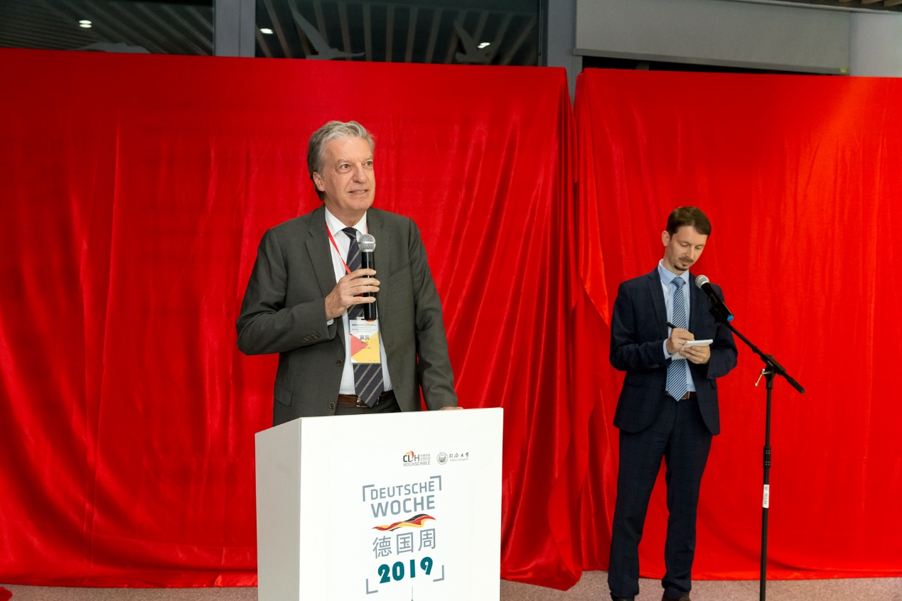 日前,同济大学第七届德国周在四平路校区中德大楼德文图书馆开幕。同济大学副校长兼同济大学中德学部主任吴志强、德国学术交流中心秘书长吕兰特(Dorothea Rüland)及德国驻上海总领事馆科教领事特里尔(Thomas Triller)出席并致辞。