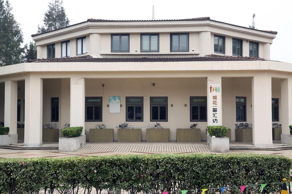 智汇坊从外面看,很像一家托儿所,米色的墙深灰的窗,已经运行5年多的智汇坊外形像一只拨浪鼓,面积千余平方米,主体建筑为八角形。远远地,“城花智汇坊”棕黄、绿、深绿四色小玩偶人形就在向我们招手。