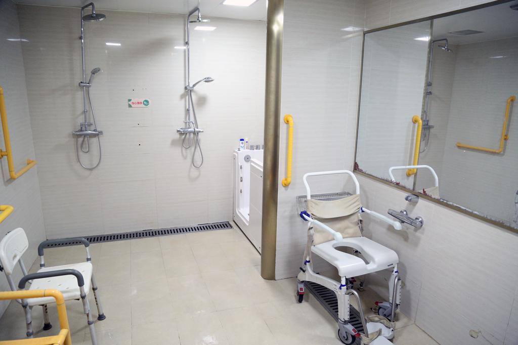 走着听着,来到了浴室门口。小何说,老人外面进来,渐渐走渐渐热,到了水龙头、浴缸边,就到了沐浴所需的温度了,浴室很大。她说:“司马老师运用日本的养老理念,她知道老人突然遇热、冷,往往都会诱生老毛病。所以从外面进来,渐渐热,身体就没事。有位老人家里是别墅,回去又回来了,因为这里的浴室大,条件比家里好。”主管小何留学西班牙学习养老,她说西班牙养老业很发达,英国、法国老人都来。