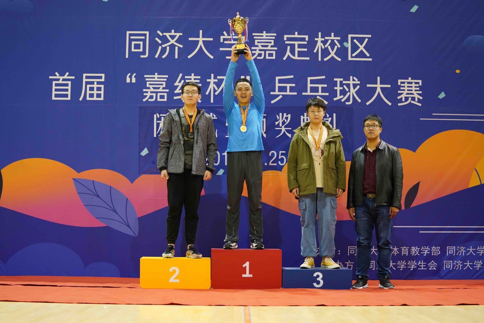 本次乒乓球联赛分为院内选拔赛和嘉定校区联赛,共有来自10个学院的200余名同学参与角逐。经过多轮选拔,共有83名同学组成的16支队伍进入校区联赛。来自电子与信息工程学院的篮球队、艺术与传媒学院的艺传一队、机械与能源工程学院的超能突击队等8支队伍成功出线。最终来自经济与管理学院的经管队力克群雄、斩获冠军,荣获亚军与季军的球队是来自交通运输工程学院的交好运一队和来自汽车学院的有一说一队。