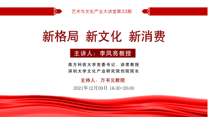 12月9日晚,人文学院艺术与文化产业大讲堂第33期在线开讲。南方科技大学党委书记兼讲席教授、深圳大学文化产业研究院创院院长李凤亮,就“新格局、新文化、新消费”这一主题进行了分享。
