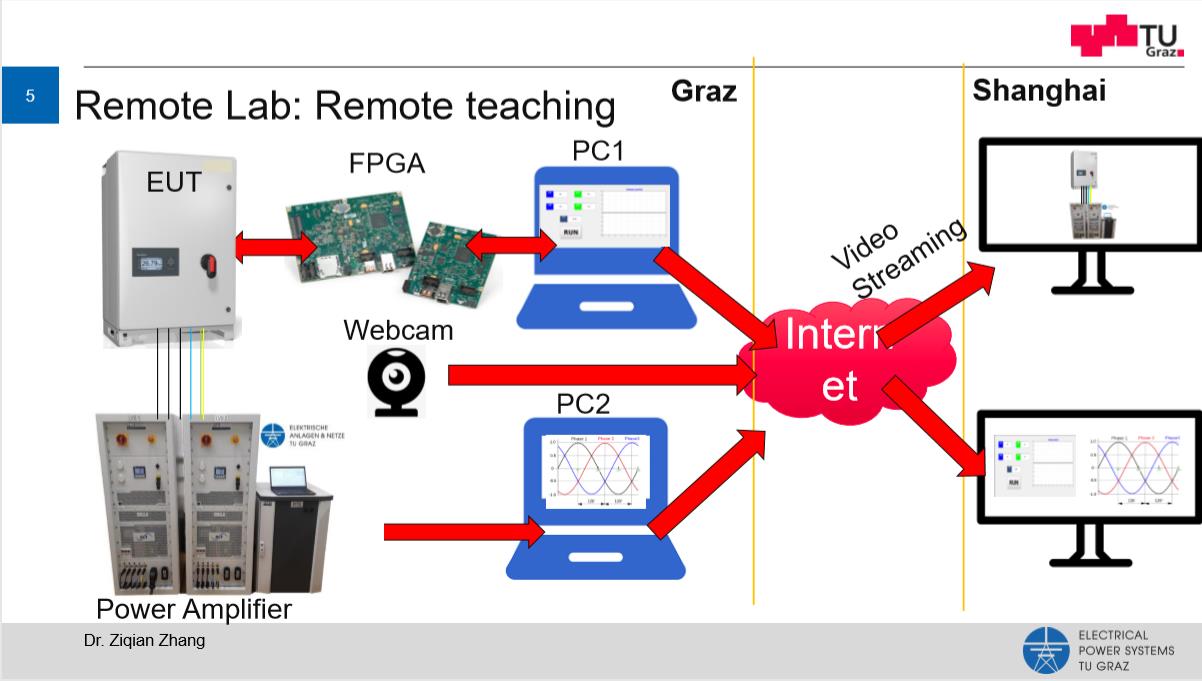 双方共同回顾了两校在2021年取得的合作成绩。其中,格拉茨工业大学青年讲师Zhang Ziqian和我校铁道与城市轨道交通研究院教授罗雁云等联合上海电机学院,共同开发了一门国际联合线上课程“现代电力系统”。该课程形式新颖、内容丰富,充分利用和整合中奥三校各学院的教学和实验室资源,基于远程实验室系统,为学生提供现代电力系统的全景式介绍和实际操作体验。基于联合课程和远程实验室系统,各方不仅开展了深入的教学合作,还为未来科研及承接工业项目奠定了基础。2021年春季学期,合作三方共有80名硕士研究生参与了该课程。