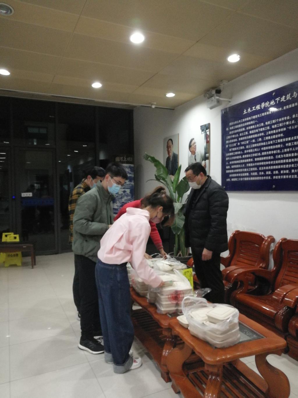 对土木工程学院地下建筑与工程系和水利工程系所在的岩土楼内的师生来说,3月9日必定是难忘的一天。短短几小时内,疫情形势迅速紧张起来。突如其来的变局难免让岩土楼内的师生感到焦急,大家纷纷询问:“我们什么时候可以出去?”“今天晚饭如何解决?”“我们晚上要在这里过夜吗?”面对大家的询问,系里领导很快与院里沟通联系,学院和上级单位了解到岩土楼师生的困境后,很快为楼内师生送来了盒饭。