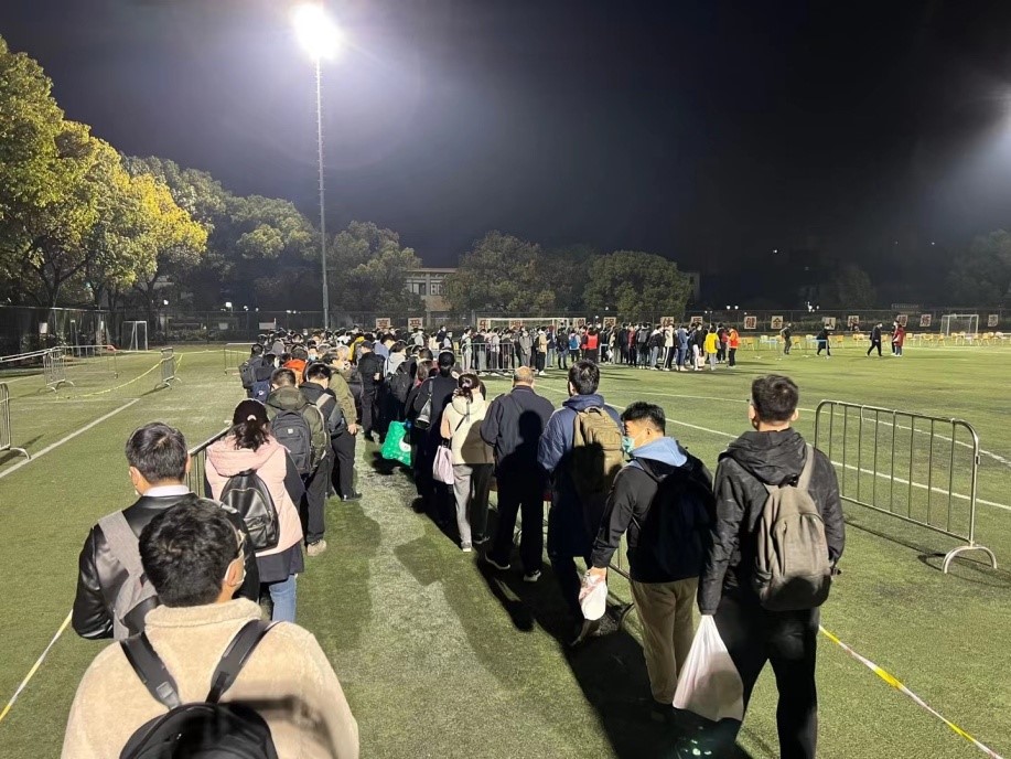 凌晨一点,终于接到了岩土楼师生做核酸检测的通知。虽然天色已深,但楼内走出的师生及物业管理人员500多人丝毫没有怨言,井然有序地听从指挥,迅速完成了检测,并向一直坚守岗位的防疫人员表示感谢。