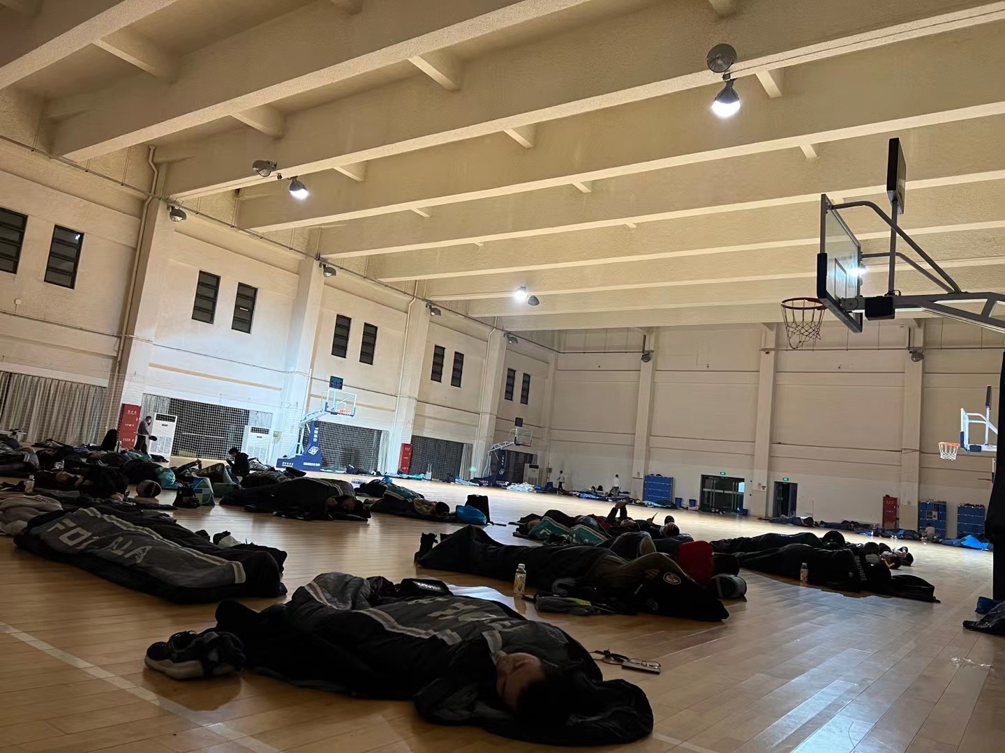 由于岩土楼要进行全面消杀,全楼师生当晚无法返回。根据安排,学生返回寝室,50岁以上教师入住干训楼,其他教师和没有住宿地的学生就在体育馆的地铺上过了一夜。虽然事发突然、条件艰苦,但大家克服困难,坦然面对。