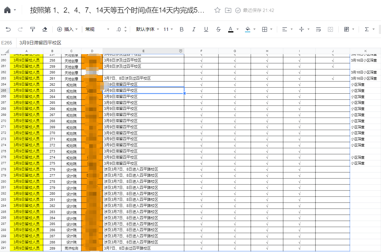 此轮疫情需在短时间内排摸掌握产业系统人员数据,3月9日晚至3月12日是学校人员底数摸清工作最重要的关键时间段。工作时间紧,加之产业系统人员分散,各单位办公场所分散、人员性质不同,校内信息不能直接转发、群发,需要一对一、点对点电话或微信通知,胡震自3月10日起全天24小时待命,值守在电脑前应对各方信息,通过电话、微信,时刻对接产业系统单位疫情防控联络员,传达沟通各类防疫信息。及时跟进产业系统留校人员情况111人、涉及3月6日及以后进入四平路校区的人员168人、各校区范围的全部企业员工4408人以及同济控股管理开通进校权限人员237人的核酸检测情况,根据核酸检测时间点紧跟各单位人员核酸情况。自3月14日起,对产业系统在沪各单位7300余人校内情况、上班情况、居家办公以及拟次日入司人员情况进行统计,严格做到当日汇总、当日汇报,不遗漏一家、不遗漏一人。