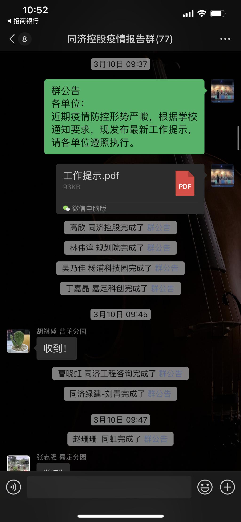 根据学校疫情防控工作要求,同济创新创业控股有限公司第一时间在党委带领下,成立公司疫情防控应急工作小组。公司全体领导干部主动担责,下沉一线,周密布置,精心安排,有条不紊推进产业系统疫情防控各项工作。3月9日晚,产业系统启动疫情防控工作联络机制,同济创新创业控股有限公司协同产业系统各家单位疫情应急工作小组,迅速恢复运转应急组织体系,主动开展人员排查,全面摸清人员底数,不间断、不停歇跟进人员核酸检测情况,根据最新防疫态势及时发布工作提示,积极应对防范各类防疫风险,切实保障产业系统平稳、有序。