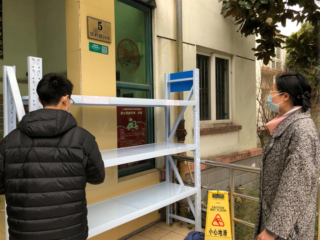 当得知学校学生处发出急需置物架的求助后,赵念带领“特派援”们联系四平路街道服务办,把7个置物架送往铁岭路同济校外博士生宿舍楼下。由周昕翔连夜加班在现场协助完成安装,用于安放隔离同学的快递和外卖。3月14日至今,周昕翔还主动代学校应急采购单层加厚毛毯300件、加固折叠床100张、睡袋150个,并于3月16日下午组织人员将上述用品送至四平路校区,累计发往同济大学校区“闪送”服务6车次。