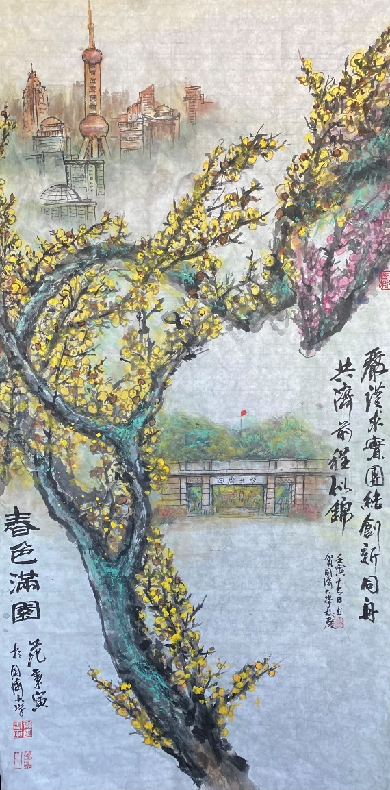 范秉寅创作的《吉祥鼎盛》,以雍容华贵的牡丹花为主体,题字“庚子共克时艰,山河无恙,辛丑如意吉祥,国泰民安”,象征着祖国在取得抗击疫情的胜利后,会越来越富强。另一幅《春色满园》,则以娇艳的春花连接同济校园与上海城市,题字“严谨求实、团结创新、同舟共济、前程似锦”,表达了对学校的诚挚祝福。