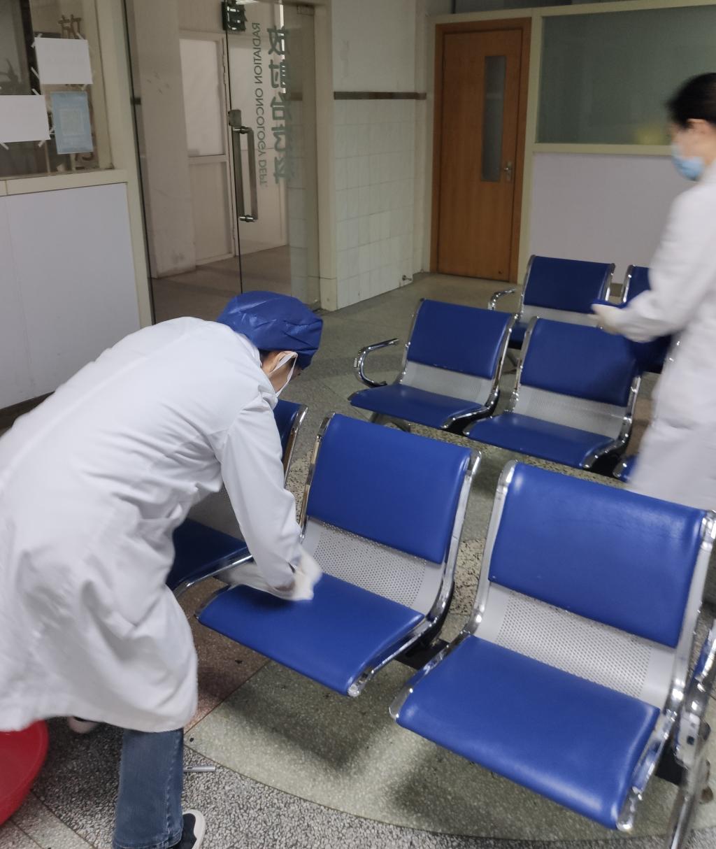 由于放疗科治疗机房只有一个,疫情期间如何保证不同风险等级的患者开展治疗是一项重大挑战。在院医务处和院感处指导下,由科主任牵头,科室核心小组商量,共同制定出三时段三等级风险消杀方案。方案把患者分为三类:低风险住院患者、低风险门诊患者以及管控区患者。每天按风险等级分时段逐次治疗,医生、技术员严格遵守疫情防控指南进行操作。每个治疗时段结束,安排专人进行患者模具、治疗床板、操作开关以及台面座椅等各项消杀。虽然工作量很大,工作时间延长很多,但为了病人的安全,科室的正常运转,放疗科的医护们不敢有丝毫疏忽,一切都在认真有序的进行中。3月以来,放疗科患者数量不减反增,达到了历史最高水平,医护人员常常需要加班加点到很晚才能及时完成各项医疗任务。