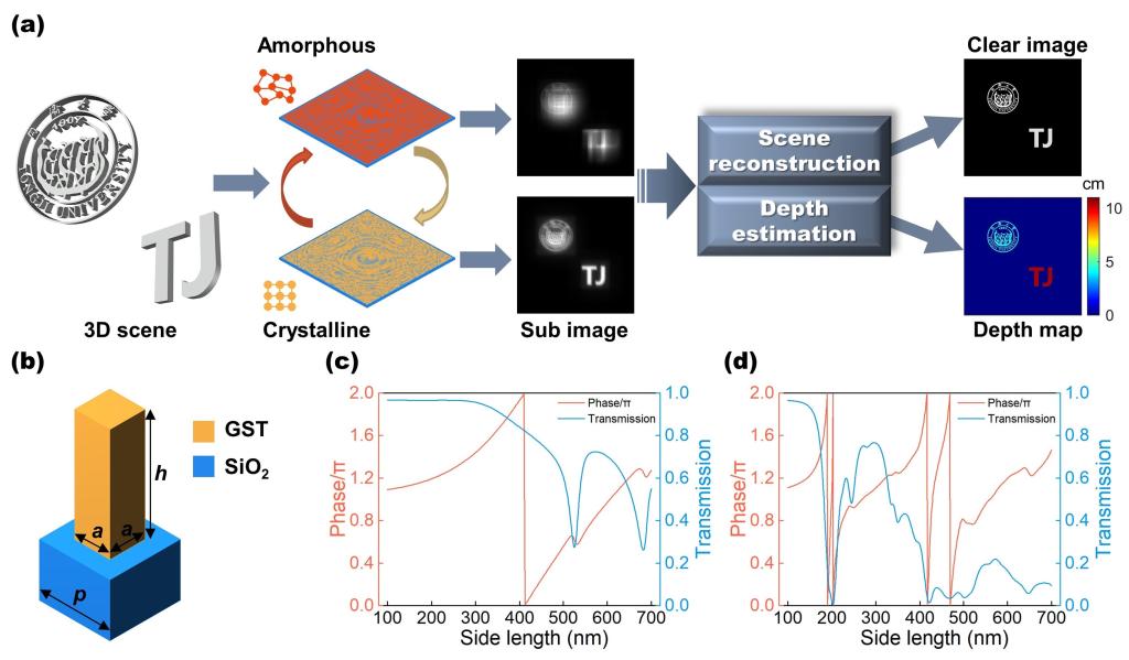 随着人工智能领域的快速发展,深度成像在诸多应用场景中发挥重要作用,如机器人避障、产品质量检测、无人驾驶和人脸识别。传统深度相机存在体积重量大、系统设计复杂、采集耗时长等局限,难以满足小型化、集成化、智能化的发展需求。马志远利用Ge2Sb2Te5(GST)相变材料设计了一种功能可重构的超透镜用于深度成像,分别在GST的晶态和非晶态下实现了深度敏感的双螺旋(DH)点扩散函数(PSF)和深度不敏感的扩展景深(EDOF)PSF,再利用反卷积算法重建出清晰的场景和相应的深度图像。该方法通过一对互补的PSF分别产生聚焦加速和旋转光束,并将其集成在一个超透镜中,在仿真模拟中实现了3.5cm-13.5cm的工作深度范围,具有紧凑、快速、无视差的优点。
