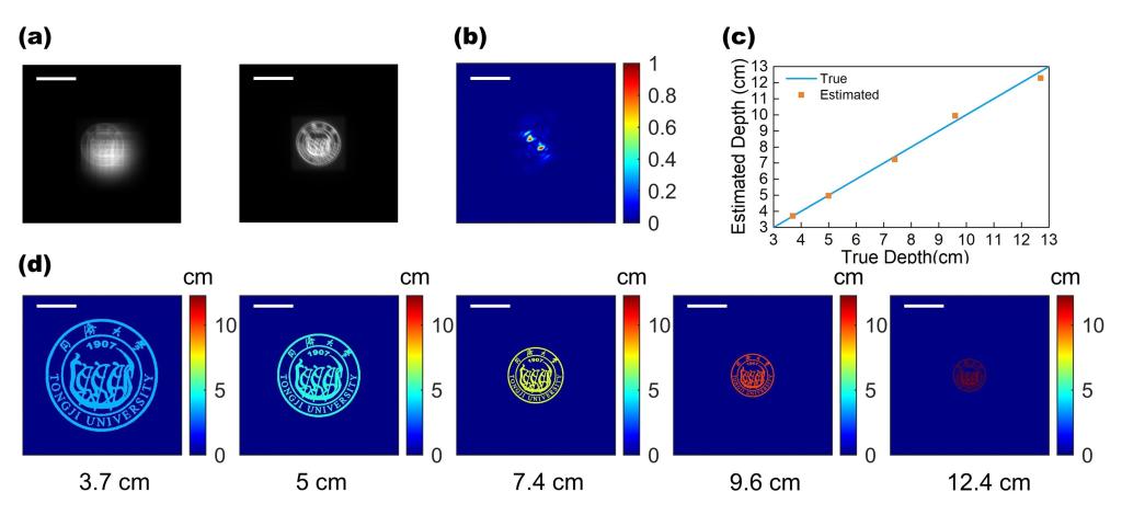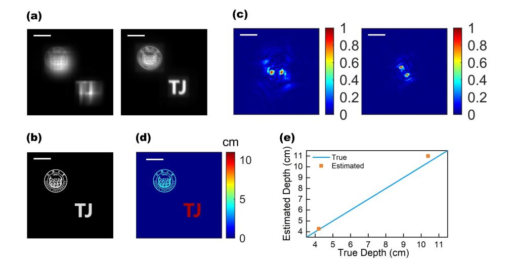 文章首先针对单一物体场景进行了深度成像模拟。通过对EDOF超透镜图像应用反卷积算法,可以重建出清晰的校徽图像。再将重建图像与DH超透镜图像反卷积,得到不同深度下校徽对应的DH-PSF。最后根据PSF焦点的旋转角度估计物体深度,获得相应的深度图像。如图所示,模拟了五个不同深度校徽的成像效果,深度误差仅为3.42%。