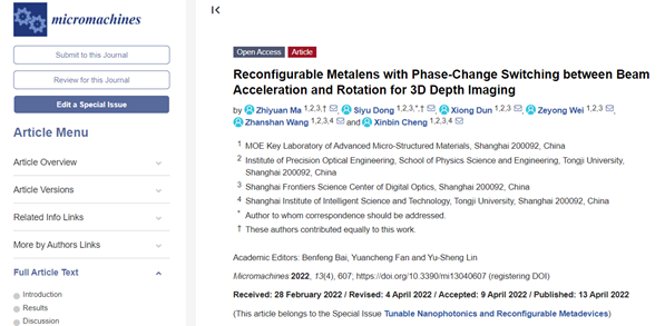 近日,物理科学与工程学院2018级物理拔尖计划2.0人才培养基地本科生马志远作为第一作者在Micromachines杂志上发表论文“基于光束加速和旋转切换的可重构超透镜实现三维深度成像(Reconfigurable Metalens with Phase-Change Switching between Beam Acceleration and Rotation for 3D Depth Imaging)”。Micromachines期刊被Scopus、SCIE (Web of Science)和PubMed等众多数据库收录,主要聚焦微纳结构、光系统、应用物理方向的科学和技术。