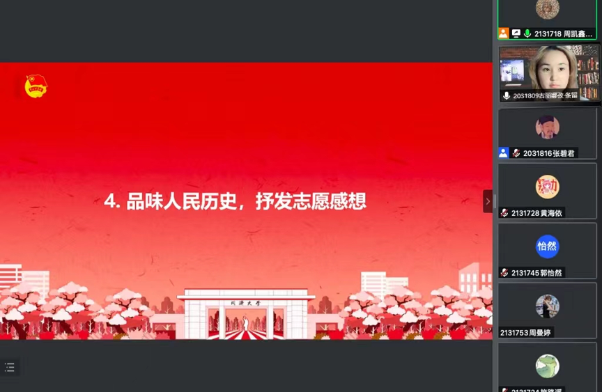 随后,2020级中文艺理班古力娜孜·条留,2021级中文艺理班郭怡然、冯霞、赵咏琦,2021级哲学班张锦、孙仲文、王燕铎7位同学分别分享了参加主题团日的感想。
