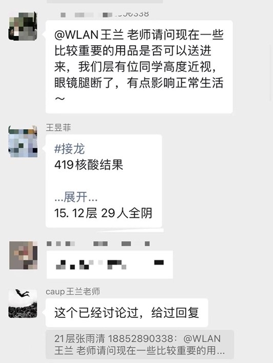 封控管理期间,1号楼每日进行核酸检测,王兰都会在现场进行监督和指挥,提醒学生保持两米间距,并及时进行消杀。